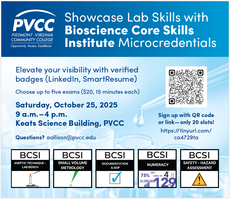 Showcase your lab skills with BCSI microcredentials and elevate your professional visibility with verified badges on LinkedIn / SmartResume. Saturday, October 25, 9am – 4pm at PVCC’s Keats Science building (registration required). Choose up to five exams ($20, 15 minutes each) in aseptic technique, small volume metrology, documentation & SOP, numeracy, and safety hazard assessment. Sign up at https://tinyurl.com/ca4729ta