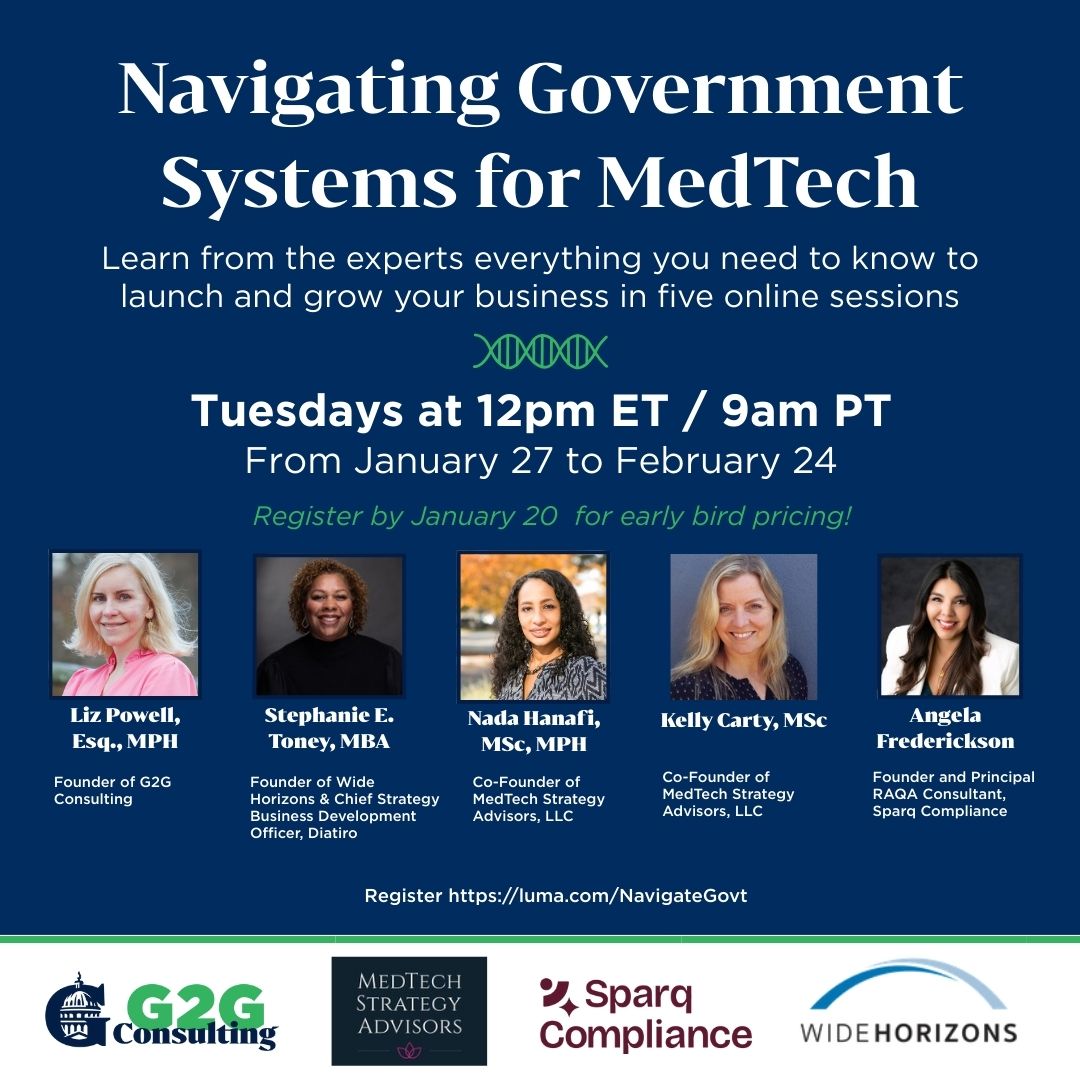 • 2/3/25: Nada Hanafi, MSc, MPH & Kelly Carty, MSc – Co-Founders of MedTech Strategy Advisors and Nada was former FDA Senior Science Health Advisor – Session: De-risking MedTech Innovation: Regulatory Strategy that Accelerates Market Entry